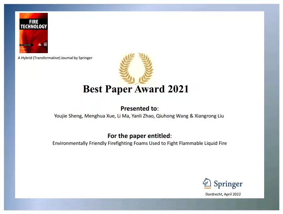 近日,美国消防协会和消防工程师协会会刊《Fire Technology》公布了2021年度最佳论文入选名单,永利yl23411青年教师盛友杰的文章“Environmentally Friendly Firefighting Foams Used to Fight Flammable Liquid Fire”获得了该期刊2021年度最佳论文奖,华人作者发表的论文仅此一篇入选。