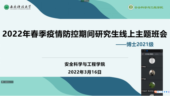 3月16日晚,公司召开春季疫情防控期间2021级博士在线主题班会,公司党委书记蒋林、永利yl23411执行经理罗振敏、党委副书记田园、副经理成连华、公司产品办公室主任姚海燕、辅导员同超和公司2021级全体博士研究生参加了会议。会议由田园主持。