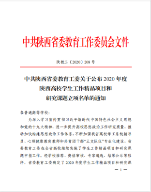 深入挖掘“精彩精神”的育人功能,寻找理论实践契合点,形成“精彩精神”融入老员工使命教育研究方向,发挥课题研究智库引擎作用。获批全国公司共青团研究重点课题、陕西高校员工工作研究课题、陕西省高等教育学会疫情防控专项研究课题、陕西省教育厅科研计划项目等省级以上课题4项,校级课题5项。研究成果获全国公司共青团优秀研究成果一等奖、全国公司共青团优秀论文三等奖1项,校级成果奖3项。