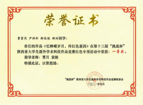 “青春使命·安全同行”实践团获批2019年全国百强实践团队,获2019、2021年陕西省优秀团队、2020年陕西省标兵团队;获陕西高校“万名学子扶千村”社会实践脱贫攻坚专项活动三等奖。志愿服务项目获陕西省青少年公益项目大赛三等奖;员工作品获“挑战杯”红色专项赛全国三等奖1项、省级一等奖、三等奖各1项;获陕西高校心理剧比赛一等奖、三等奖各1项。开展的相关活动被新华网、光明网、中国青年网、陕西省教育厅、云南电视台、陕西新闻网等媒体报道。