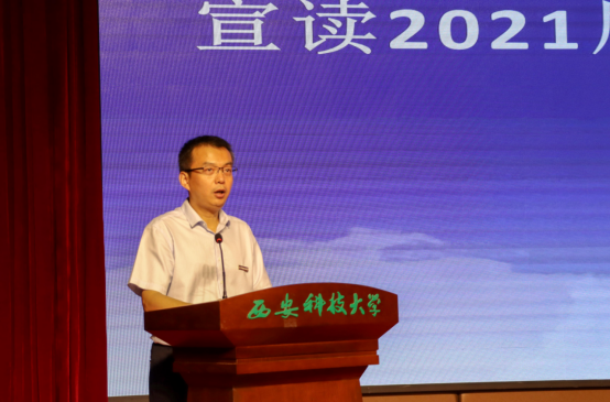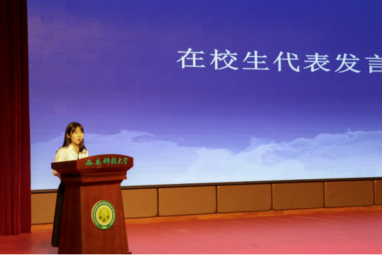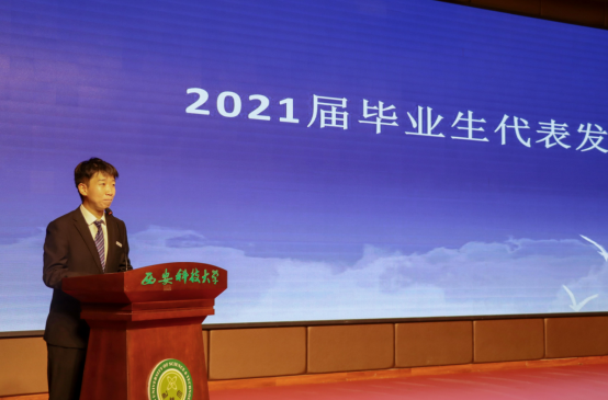 毕业典礼在庄严的国歌声中拉开序幕,2021届毕业生代表常泽晨、在校生代表2018级员工翟芳妍、毕业班辅导员郭胜忠进行了发言。