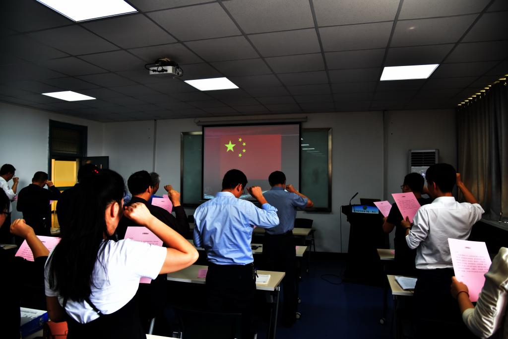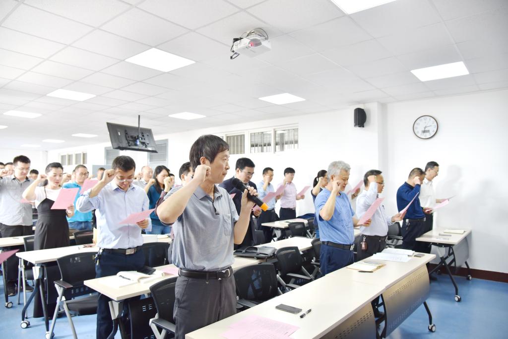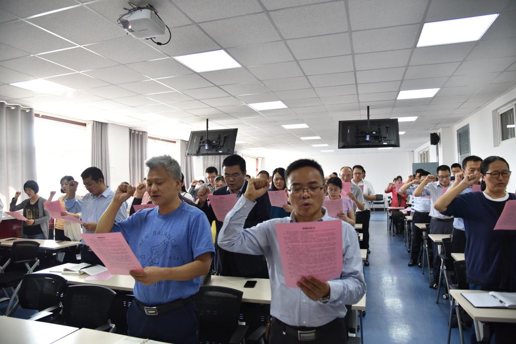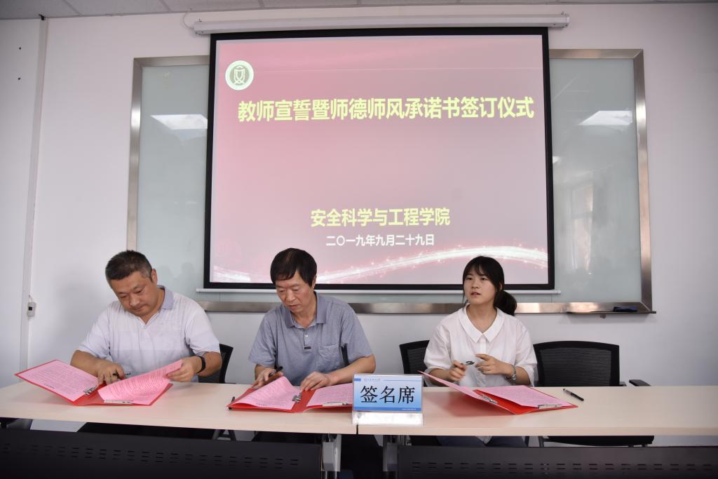 随后,公司举行了教师宣誓仪式,在领誓人张俭让教授的带领下,参会教师全体肃立、右手举拳,面对国旗,庄严宣誓。公司老中青教师代表张俭让教授、王建国副教授、芦星博士上台签订《师德师风承诺书》,代表了公司老中青三代教师优秀师德师风精神的传承。