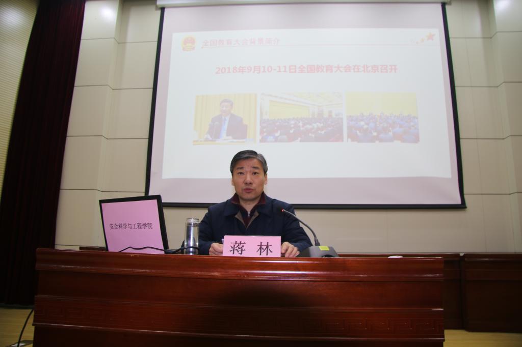 蒋林从深刻认识全国教育大会的背景与意义、全面领会习近平总书记关于教育工作的重要论述和认真落实全国教育大会精神,加强教师队伍建设三个方面就学习全国教育大会精神为广大教职工带来一场精神盛宴,对在各个岗位上为公司教育事业发展付出辛勤劳动的广大教师表示衷心感谢,同时向广大教师提出希望:希望广大教师深入学习和落实全国教育大会精神,牢记“教书育人”、“立德树人”的神圣使命,按照习近平总书记提出的“三个牢固树立”、“四个引路人”、“四个相统一”的要求,争做新时代“四有”好老师,发扬主人翁精神,秉承公司“励志图存,自强不息”的大学精神,深化永利yl23411综合改革,发挥安全学科领头雁的作用,为把公司建设成为世界有影响、国内一流的特色鲜明的高水平教学研究型大学而不懈努力。