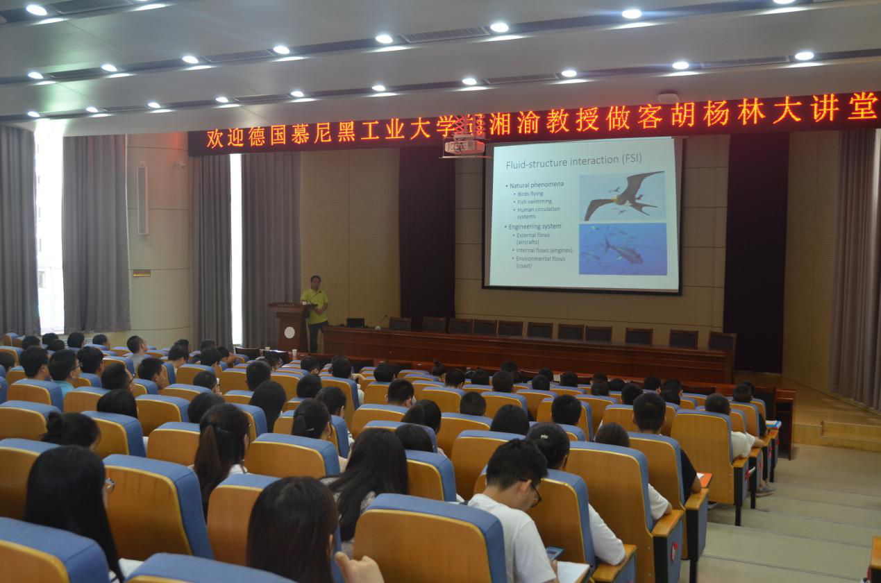 9月4日上午,德国慕尼黑工业大学(Technical University of Munich)特聘教授、空气动力学所项目组组长、国际知名空气动力学与流体力学专家胡湘渝教授做客公司“胡杨林大讲堂”,作了题为《流体-结构相互作用的光滑粒子动力学(SPH)建模》的学术报告。报告由研究生院主办,永利yl23411承办,永利yl23411陈晓坤教授主持,全校260余研究生及教师聆听了报告。
