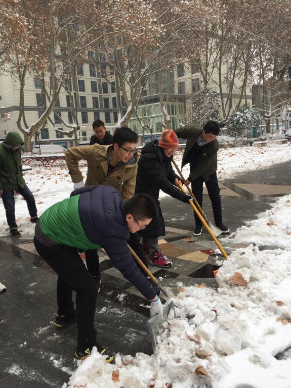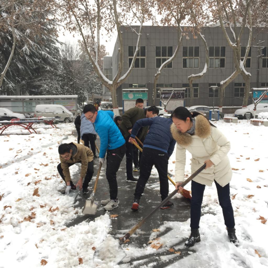 早上10:00,永利yl23411雁塔校区,永利yl23411研究生党员和积极分子在党委书记杜勇、副书记田园以及辅导员王倩的带领下对卫生责任区以及主干道上的积雪进行了清理。
