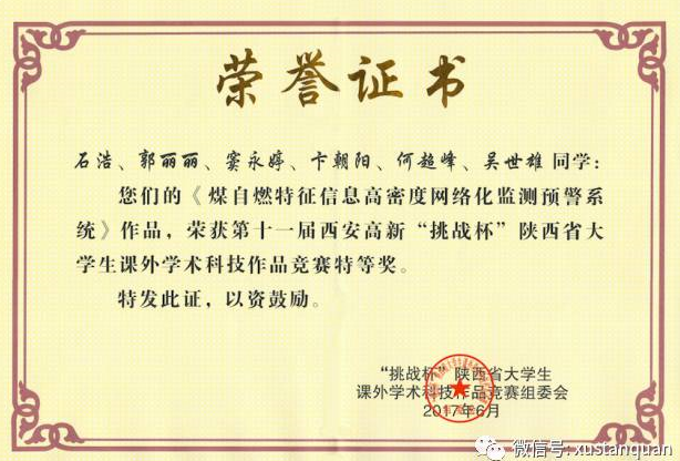 经过激烈角逐,公司王伟峰、邓军老师指导,石浩、郭丽丽等6名同学完成的《煤自燃特征信息高密度网络化监测预警系统》荣获特等奖;
