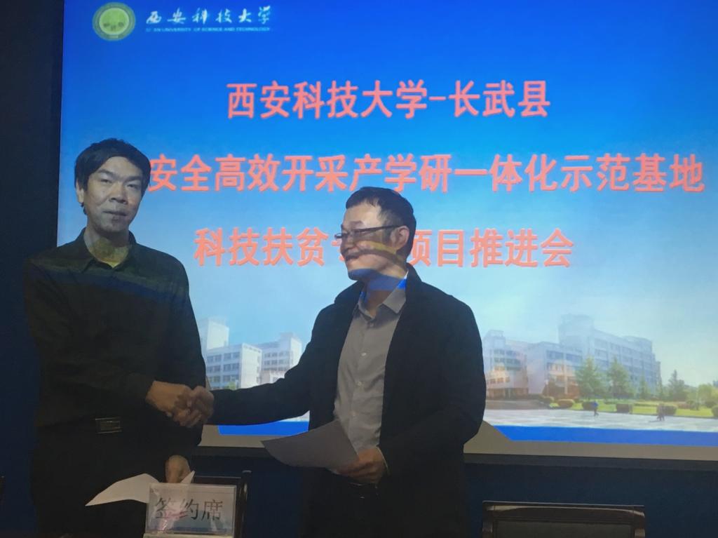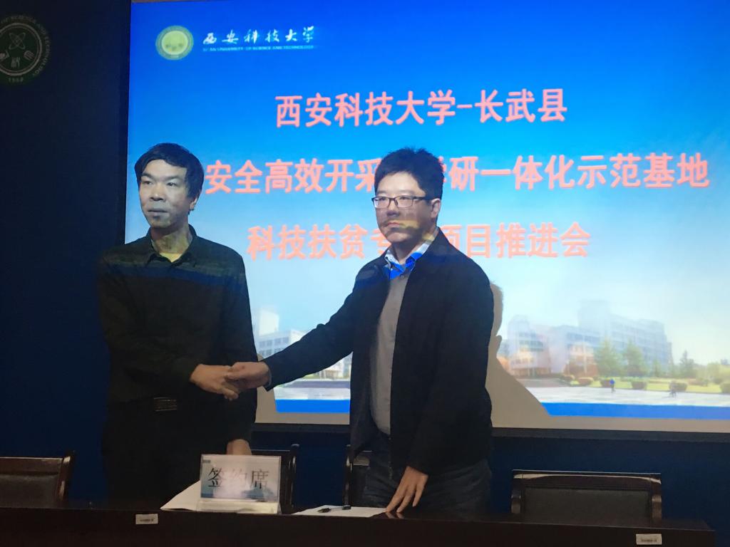 10月15日上午,在公司召开的长武县煤炭安全高效开采产学研一体化示范基地建设推进会上,永利yl23411教师党支部院金永飞教授和张超教授分别与校科技处处长文虎教授签订了科技扶贫项目协议书。