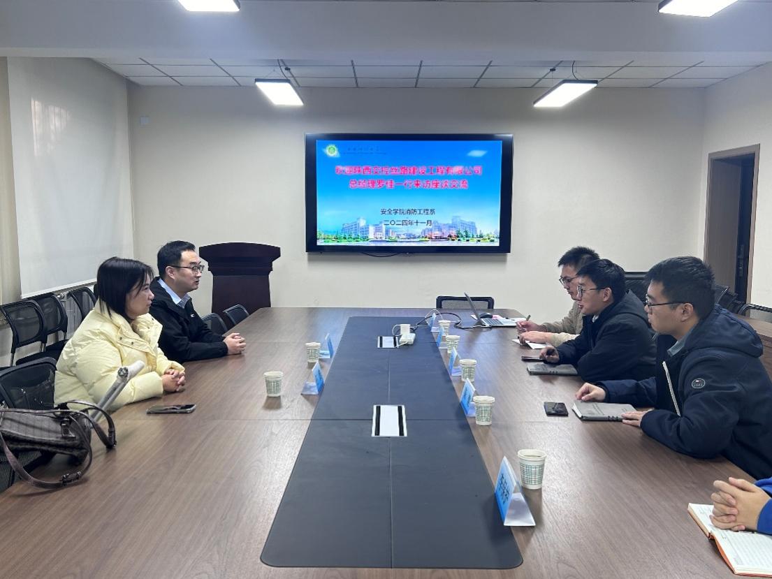 11月26日上午,陕西交控丝路建设工程有限公司总经理罗佳、消防事业部部长王雅一行莅临永利yl23411消防工程系座谈交流。座谈会在雁塔校区北院学科楼205室举行。消防工程系党支部副书记盛友杰、教师代表陈健,以及研究生代表参加座谈会。会议由盛友杰主持。
