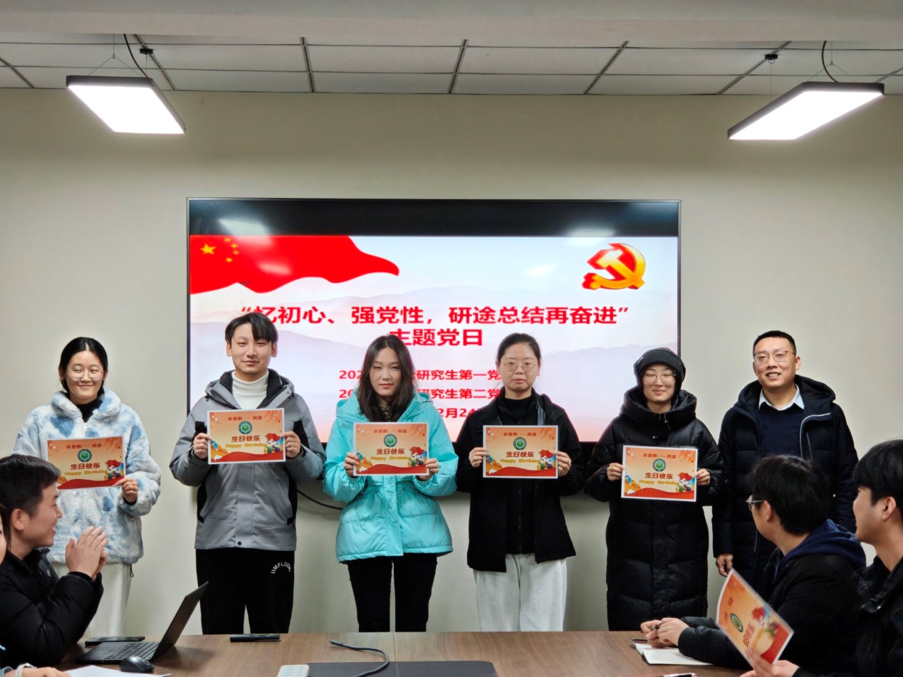 王凯充分肯定了2023级研究生党员在2025年度取得的成绩。他强调,重温入党誓词、为党员过“政治生日”,是基层党组织开展党内政治生活的重要方式。希望全体党员常思“当初入党为什么、如今在党做什么、今后为党留什么”,在实际工作生活中时刻以党员标准严格要求自己,自觉增强党性锻炼,充分发挥先锋模范作用。一要持续强化理论武装,特别是强化对党的二十届四中全会精神的学习,深入挖掘学科交叉点和新兴产业链,将其纳入个人未来发展规划中。二要做好个人学业规划和学术成果产出,把握好学位申请时间、流程和节点,制定、细化重点任务推进计划,统筹好学业进展与求职创业。三要积极关注人才供需动态和校内外招聘信息,主动拓展就业渠道和争取面试机会,将“小我”融入“大我”,到基层、西部、祖国需要的地方去建功立业。四要学会压力疏导与心理调适,加强与导师、辅导员、同学的沟通交流,主动关心关注自身和同学,共同筑牢校园安全稳定的屏障。